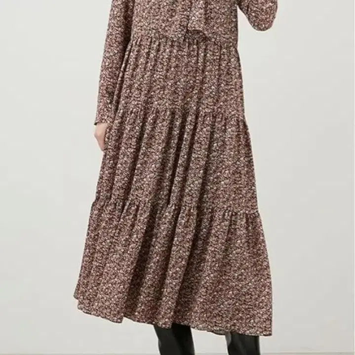 새상품급 브라운 계열 꽃무늬 리본 타이 롱 원피스 미라 오웬