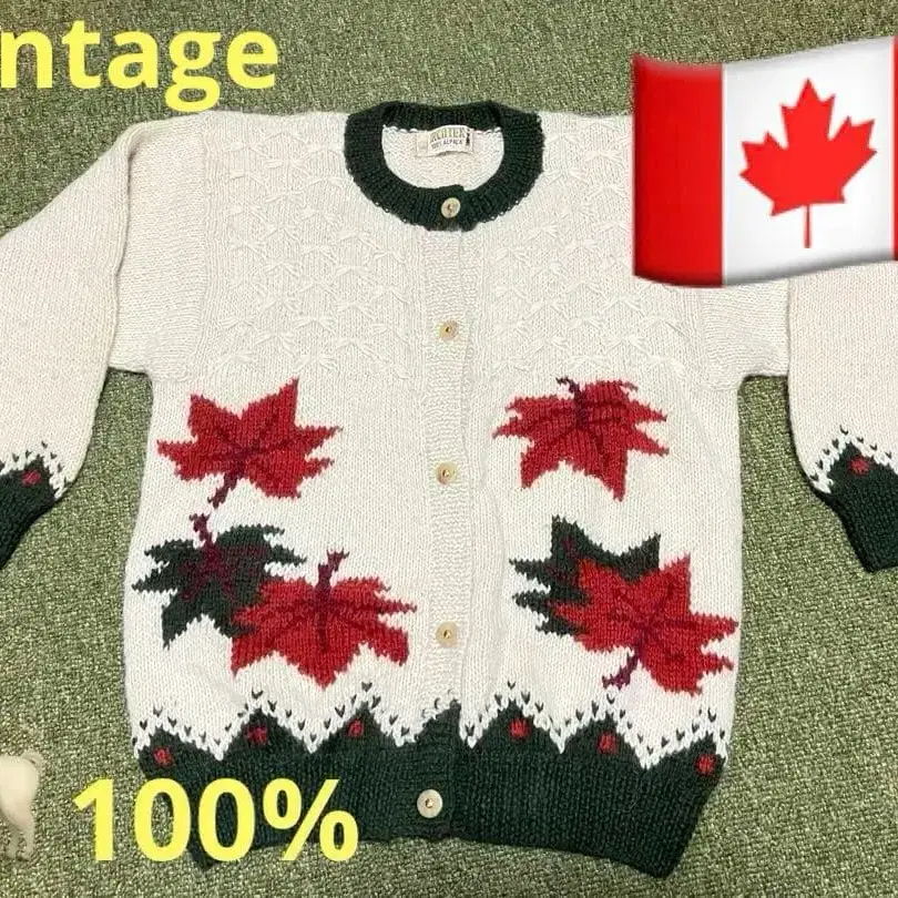 90's 최고급 본국 캐나다에서 구매 정통 MADE IN CANADA 알파카 100% 최고의 촉감! 메이플 리프 디자인의 크림색 니트 가디건, 단추식으로 여성용으로 최적. 사이즈 - M