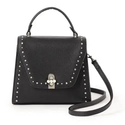 스터드 장식이 있는 블랙 핸드백, 조절 가능한 숄더 스트랩 포함.