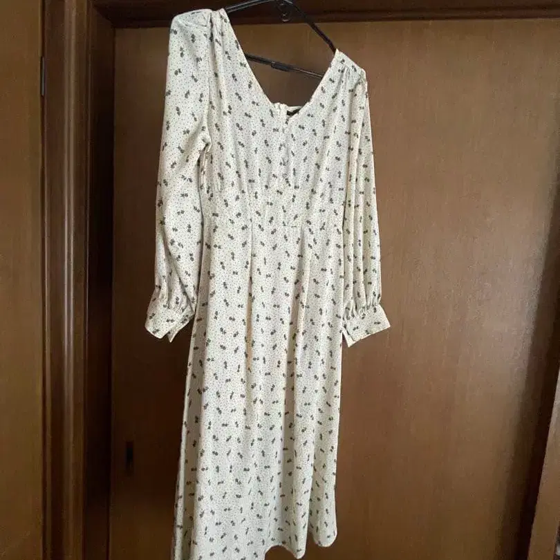 크림색 꽃무늬 롱 원피스, 긴팔, A라인 디자인.