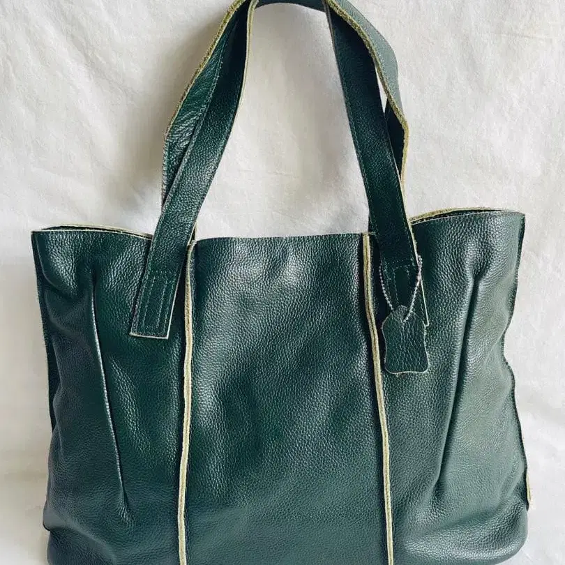 다크 그린 색상의 가죽 토트백, 대비되는 스티치가 특징입니다. - 색상: 다크 그린 - 소재: 가죽 - 디자인: 토트백 - 특징: 대비 스티치 - 택: 가죽 택 방문해 주셔서 감사합니다.