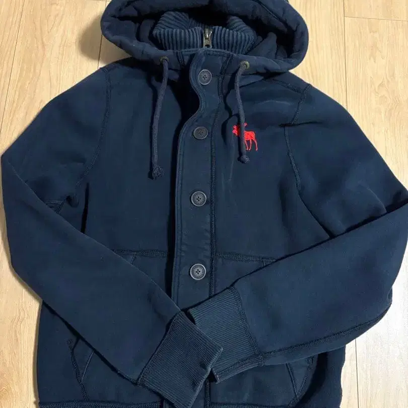 후드 부착 네이비 후드티, 리브 디테일이 특징.