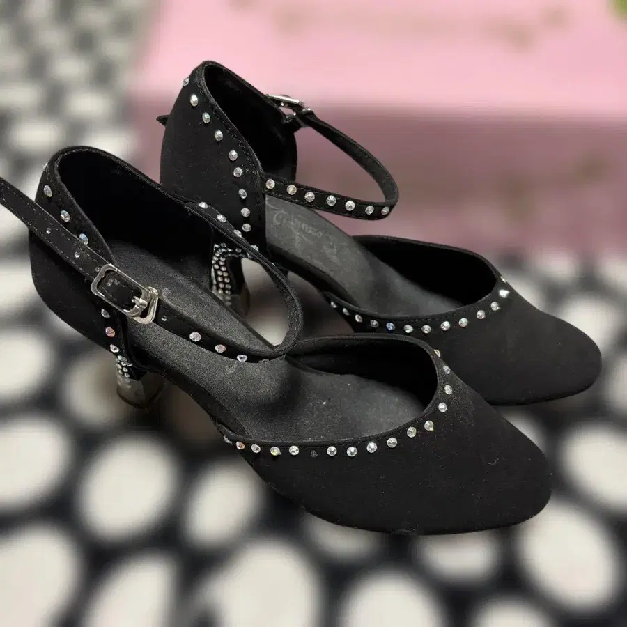 스톤 장식의 블랙 하이힐, 사이즈 22.5cm, 힐 약 7cm.