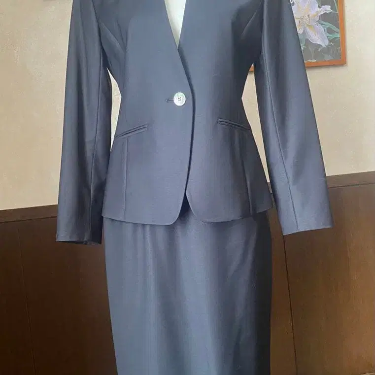 DAKS 닥스의 네이비 색상 노카라 자켓과 스커트 셋업입니다.