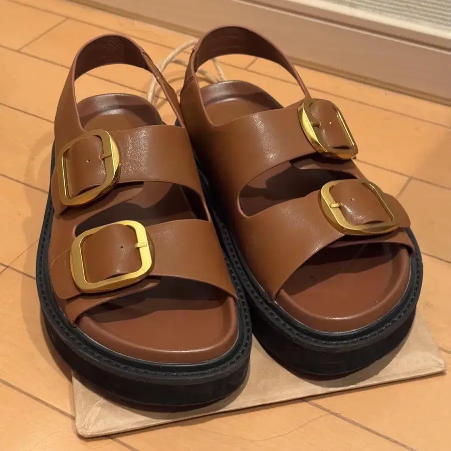 브라운 색상의 스트랩 2개 샌들, 골드 컬러 버클이 달린 스타일리시한 디자인.