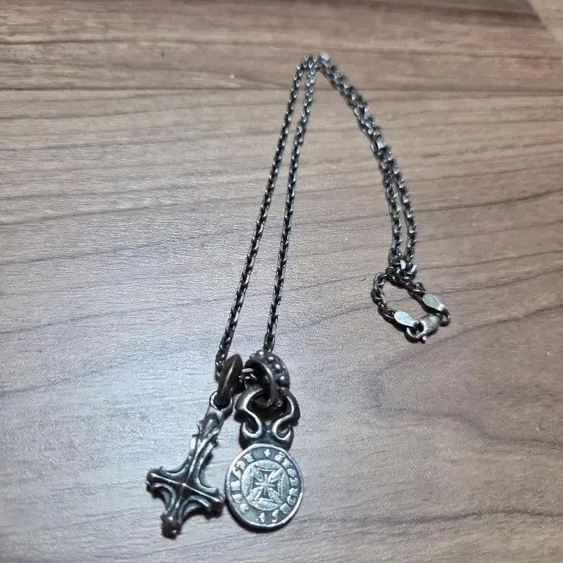 loud style design의 목걸이입니다. 크로스는 일반 매장에서 구매한 것이지만, 코인 모양의 탑은 다른 사이트에서 구매한 것으로 현재는 단종되었다고 들었습니다. 크로스의 3면에 다이아몬드가 박혀 있습니다. 소중히 간직해 왔으나 사정이 바뀌어 다시 판매합니다. - 타입: 목걸이 - 소재: 금속 - 디자인: 크로스와 코인 참 - 색상: 실버 - 상태: 약간의 흠집 있음 소재 - 실버 925 / 다이아몬드 부속품 - 부속물 없음. 체인은 원하시면 함께 드립니다. 흠집, 변색 등 - 있음. 닦으면 깨끗해질 정도입니다.