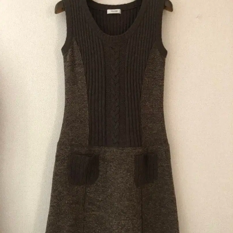 다크 브라운의 슬리브리스 니트 원피스, 케이블 니트 편직과 2개의 포켓이 특징입니다.