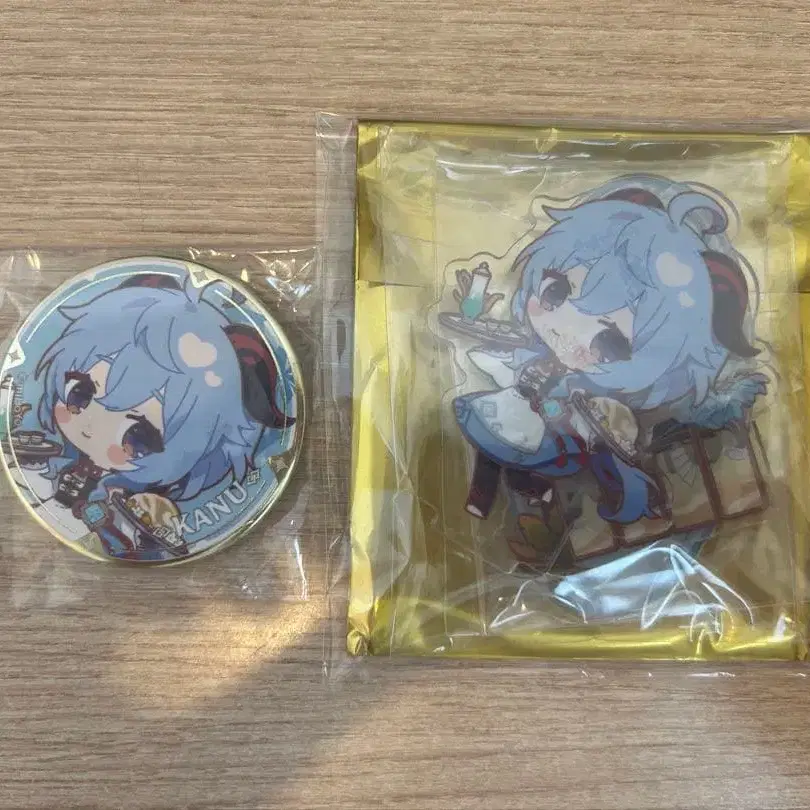 원신 캐릭터인 감우의 SD 캐릭터 아크릴 스탠드와 캔뱃지입니다.