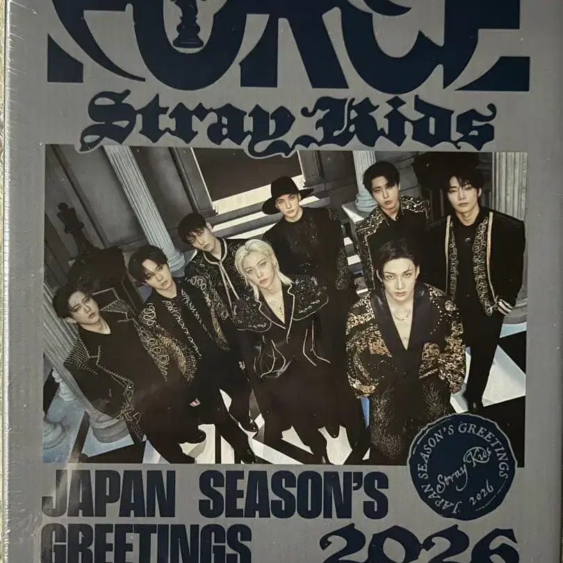 Stray Kids의 2026 시즌 그리팅, FORCE 테마의 그룹 사진 포함.