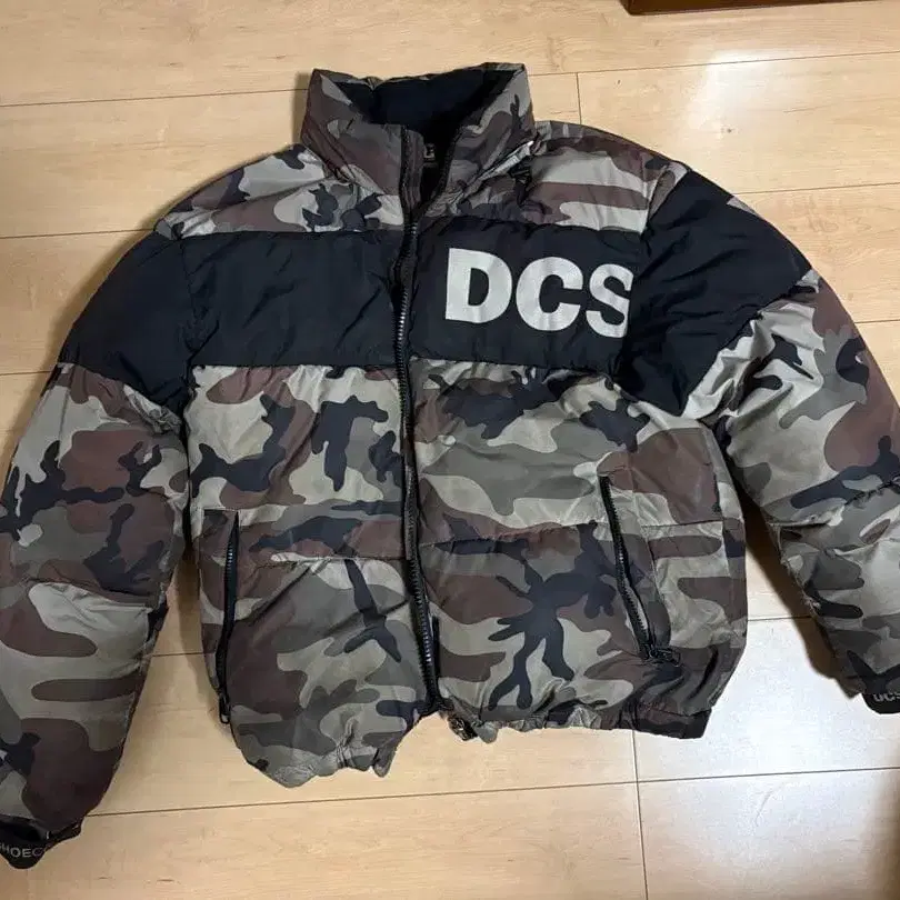 카모 패턴의 DC SHOE CO USA 다운 자켓, M 사이즈, DCS 로고 포함.