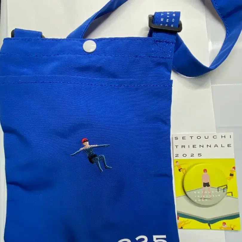 선명한 파란색 사코슈, 자수 디자인이 특징. - 색상: 파랑 - 디자인: 수영 캐릭터 자수 - 사이즈: 소형 - 이벤트: SETOUCHI TRIENNALE 2025 방문해 주셔서 감사합니다. 색상 - 네이비 계열 소재 - 나일론