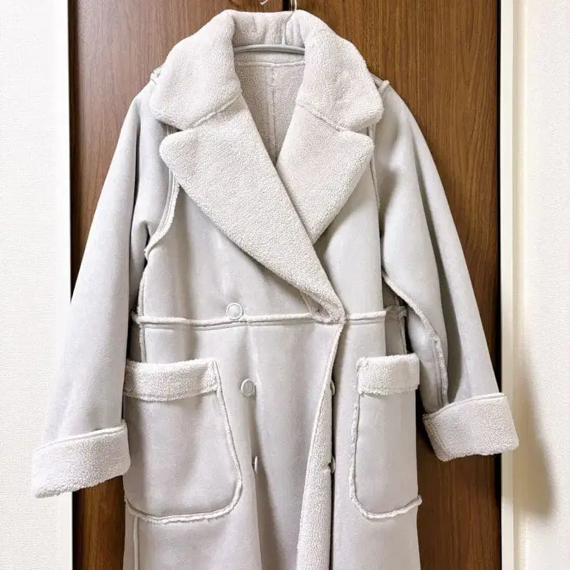 방문해 주셔서 감사합니다. Heather의 라이트 그레이 무스탕 코트입니다. 리버서블로 착용할 수 있습니다. 소매를 접어 입어도 귀엽습니다. 시착만 한 상품이며, 새상품급입니다. (착용 이미지는 다른 색상이지만 참고용으로 올립니다.) - 색상: 라이트 그레이 - 디자인: 더블 브레스트 - 소재: 무스탕 - 포켓: 큰 프론트 포켓 - 스타일: 롱 코트 - 옷깃: 라펠 옷깃