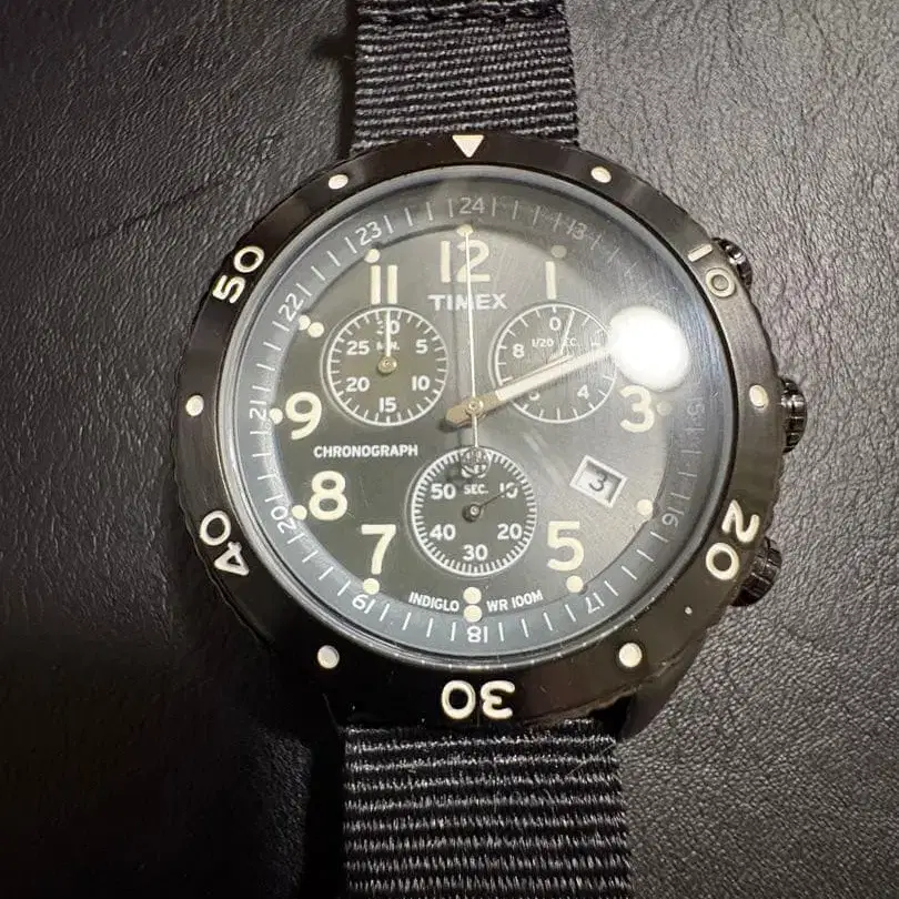 블랙 나일론 스트랩과 크로노그래프 기능을 갖춘 TIMEX 손목시계. - 브랜드: TIMEX - 모델: CHRONOGRAPH - 색상: 블랙 - 스트랩 소재: 나일론 - 기능: 크로노그래프 - 방수 성능: WR 50M 중고품입니다. 화이트 버튼 다운 셔츠에 맞춰 사용했습니다. 방문해 주셔서 감사합니다.