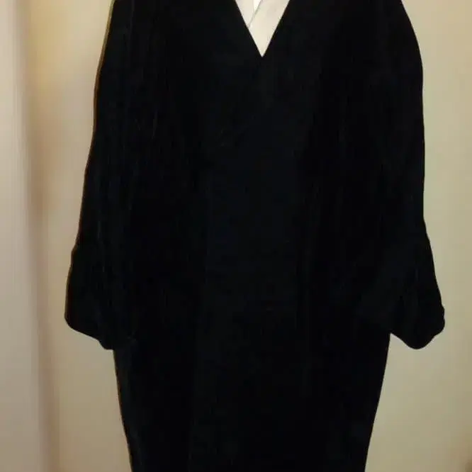 광택감이 있는 블랙 벨벳 원단으로 털이 있어 따뜻합니다. 카라는 헤치마 칼라로 소매는 몸판에서 이어지는 모몽가 같은 소매입니다. 여밈은 더블이며 동일 원단의 호두 단추가 달려 있습니다.