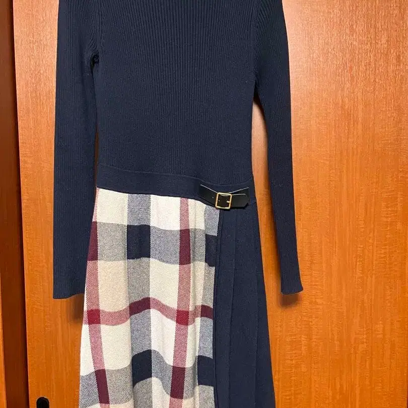 네이비 니트 상단과 체크 무늬 스커트 디자인이 특징인 원피스입니다. 미사용에 가까움과 흠집이나 얼룩 없음의 중간 정도입니다. 2회 착용했습니다. - 브랜드: BLUE LABEL CRESTBRIDGE - 색상: 네이비 체크 무늬 - 스타일: 니트 원피스 - 사이즈: 36 - 디자인: 긴팔 벨트 포함 방문해 주셔서 감사합니다. 사이즈 - M