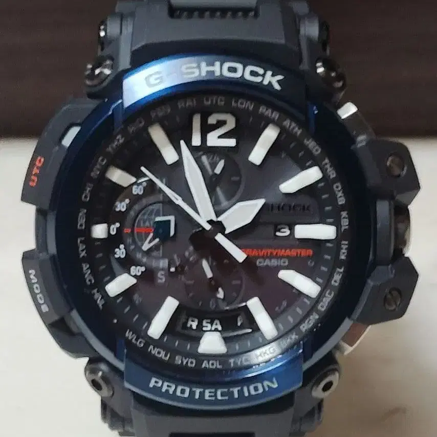 ※ 해당 상품은 시계 단품입니다. 상자, 설명서 등의 부속품은 없습니다. 카시오의 지샥, 그래비티마스터입니다. 모델번호는 GPW-2000-1A2입니다. 상품은 2, 3회 사용한 후 시계 케이스에 보관했던 것입니다. 정상 작동품입니다. 충전도 아직 절반 정도 남아 있으며, 솔라 충전도 가능합니다. 거의 사용하지 않았기 때문에 베젤에 사용감은 전혀 없습니다. 긁힌 자국 등도 보이지 않습니다. 다만, 사진으로는 보기 어려울 정도의 희미한 흠집이 케이스 하단에 보이는 것 같으며, 사진 7번째 금장 장식 부분에 미세한 흠집이 있습니다. 신경 쓰이시는 분은 삼가해 주시기 바랍니다. 200m 방수 기능을 갖춘 G-SHOCK GRAVITYMASTER, 블랙과 블루의 스타일리시한 디자인. - 브랜드: G-SHOCK - 모델명: GRAVITYMASTER - 방수 성능: 200m 방수 - 색상: 블랙/블루 - 벨트 소재: 러버 방문해 주셔서 감사합니다.