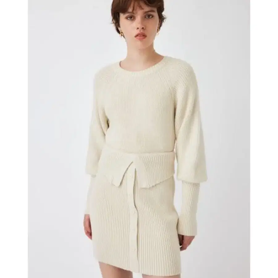 스커트와 상의가 레이어드된 듯한 디자인이 귀여운 니트 원피스.