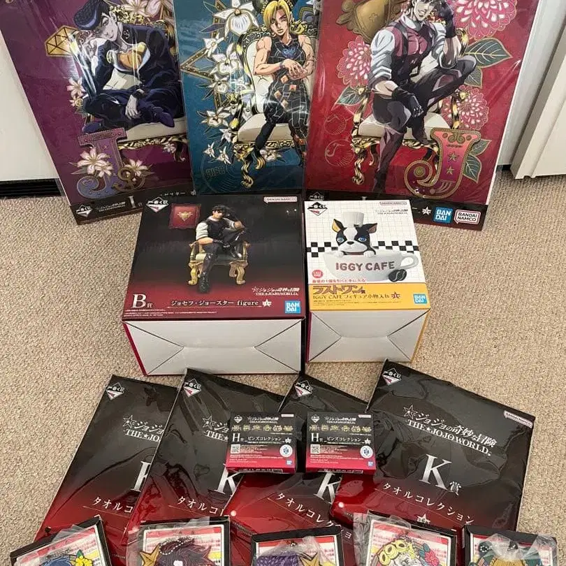죠죠의 기묘한 모험 The Jojo World B상 조셉 죠스타 G상 러버 참 x5 (중복 없음) H상 핀즈 컬렉션 x2 (죠나탄, 죠린) I상 포스터 x3 (중복 없음) K상 타월 컬렉션 x4 라스트 원상 IGGY CAFE 피규어 소품함 *모두 새상품, 미개봉. 관심 있으신 분은 잘 부탁드립니다.