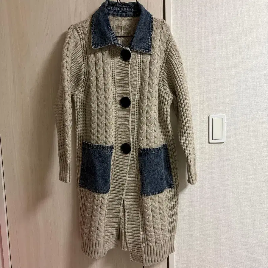 아주 귀여워요! 베이지 색상의 롱 가디건입니다. 데님 도킹과 큰 버튼이 멋져요!