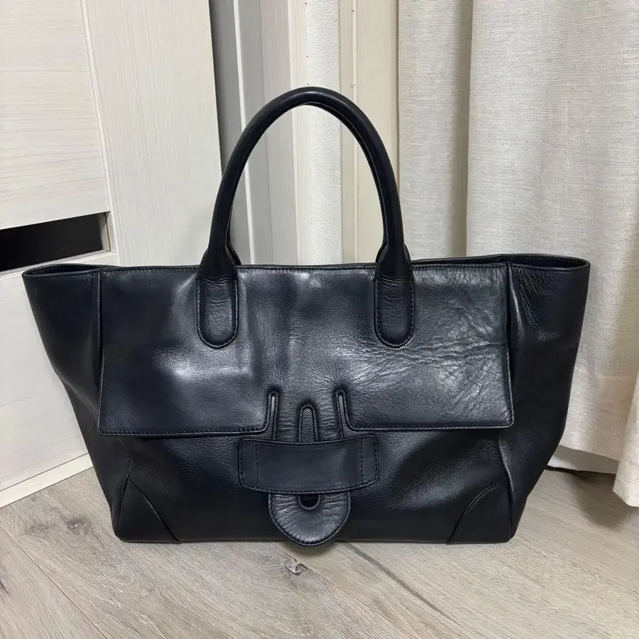 틸라 마치의 심플하고 세련된 디자인의 블랙 가죽 토트백.