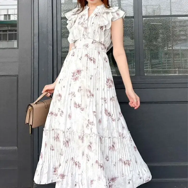 택 포함 새상품 토코 허리 셔링 뉴앙스 플라워 쉬폰 플리츠 원피스