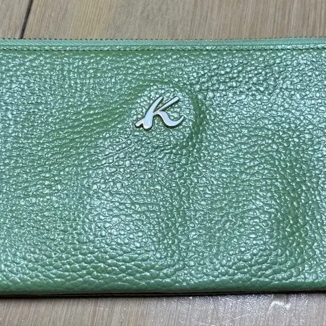 자동 번역되었어요. 원문보기그린 가죽 소재의 장지갑, K 로고 포함.