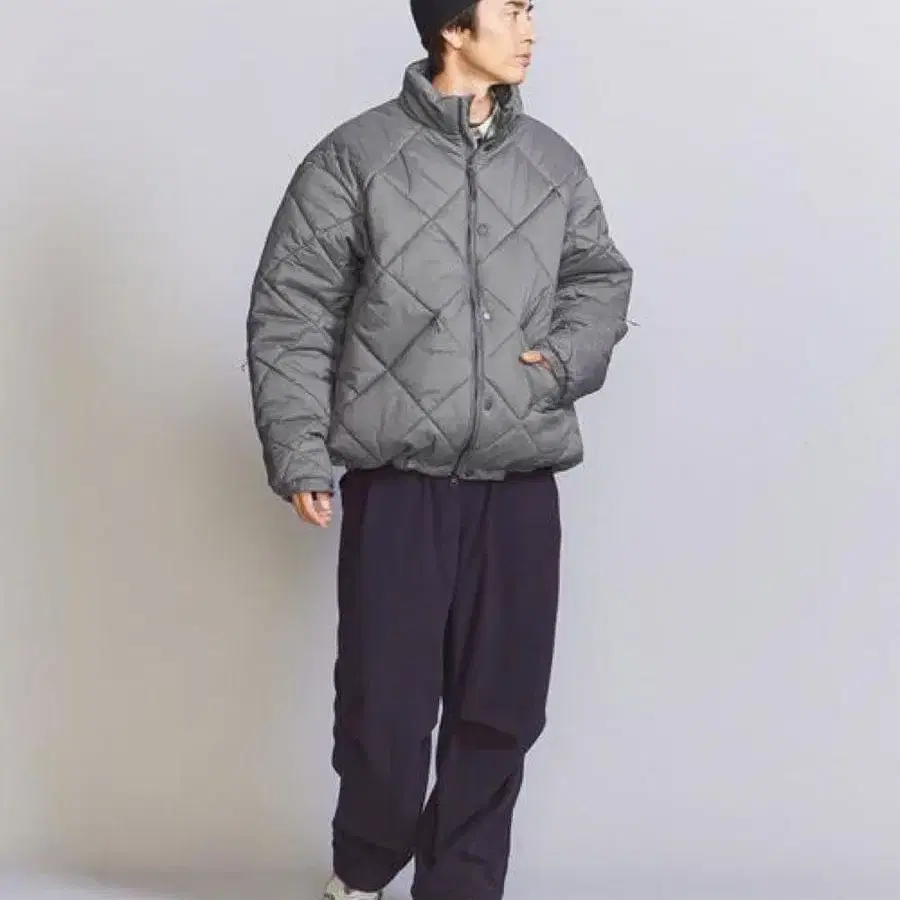 그레이 색상의 퀼팅 숏 자켓으로, 단추식과 포켓이 있어 실용성도 겸비했습니다.