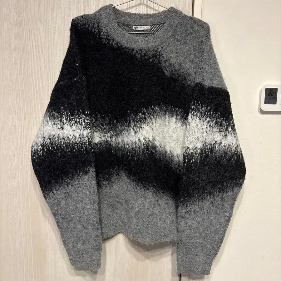 그레이와 블랙의 그라데이션 디자인 크루넥 니트 스웨터.
