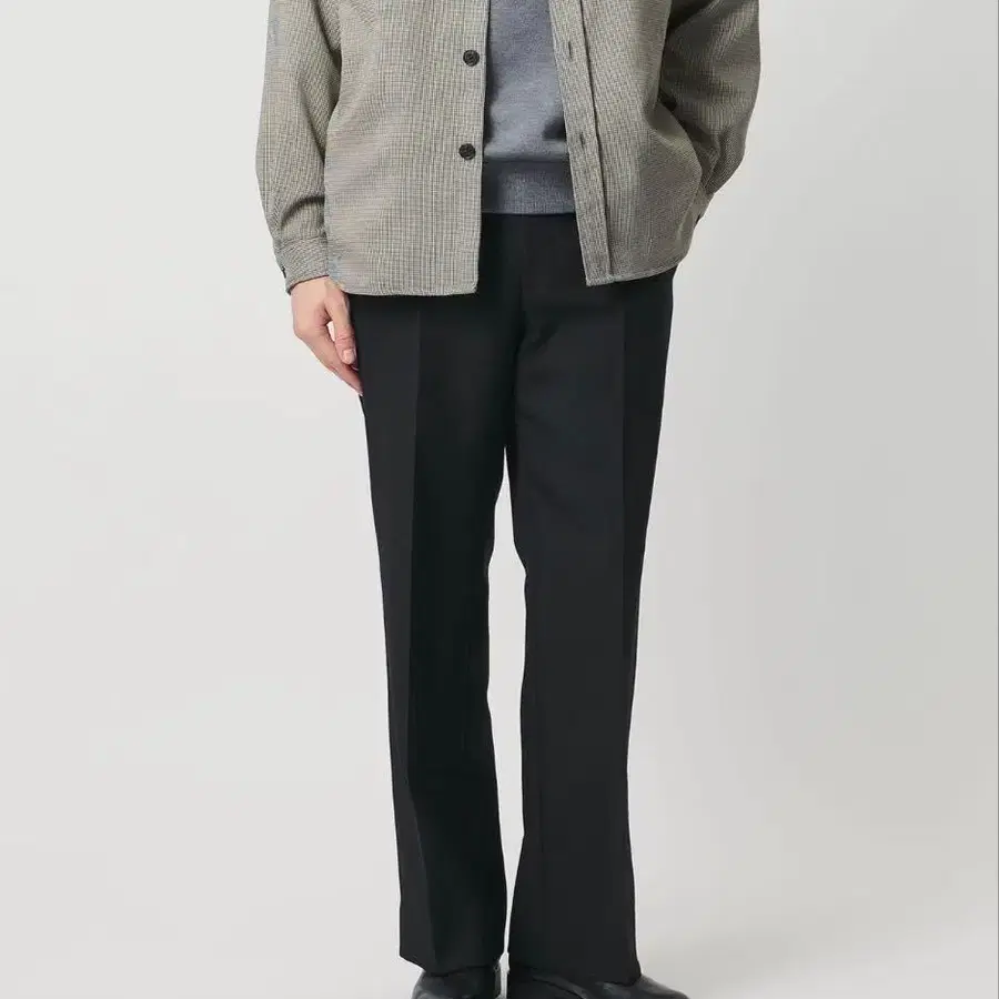 허리 둘레를 깔끔하게 마무리한 노플리츠 사양에, 무릎부터 밑단까지 여유를 준 와이드 스트레이트 실루엣.