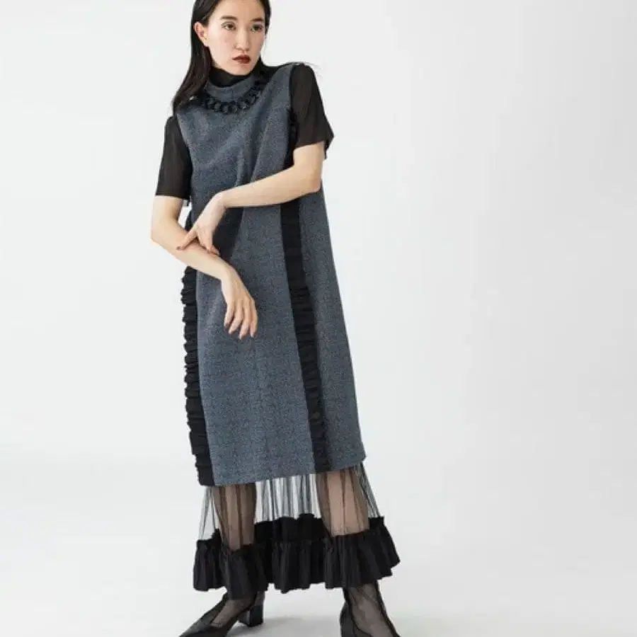 디자인 밀도가 높은 구조적인 트위드와 대조되는 섬세한 튤을 맞춘 레이어드 스타일 원피스. UNITED TOKYO다운 바이컬러의 샤프한 커팅에 이번 시즌 트렌드인 드라마틱한 플리츠 프릴을 더해 곡선을 강조했습니다. 의류 중심에 시선을 모아 전체 실루엣을 깔끔하게 보여줍니다. 카라에는 탈부착 가능한 체인 목걸이가 달려 있어 액세서리 없이도 한 장으로 멋스러운 임팩트 있는 디테일입니다. 레이어드한 튤 스커트는 밑단에 플리츠를 덧대어 시각적으로 중후한 느낌을 연출합니다.
