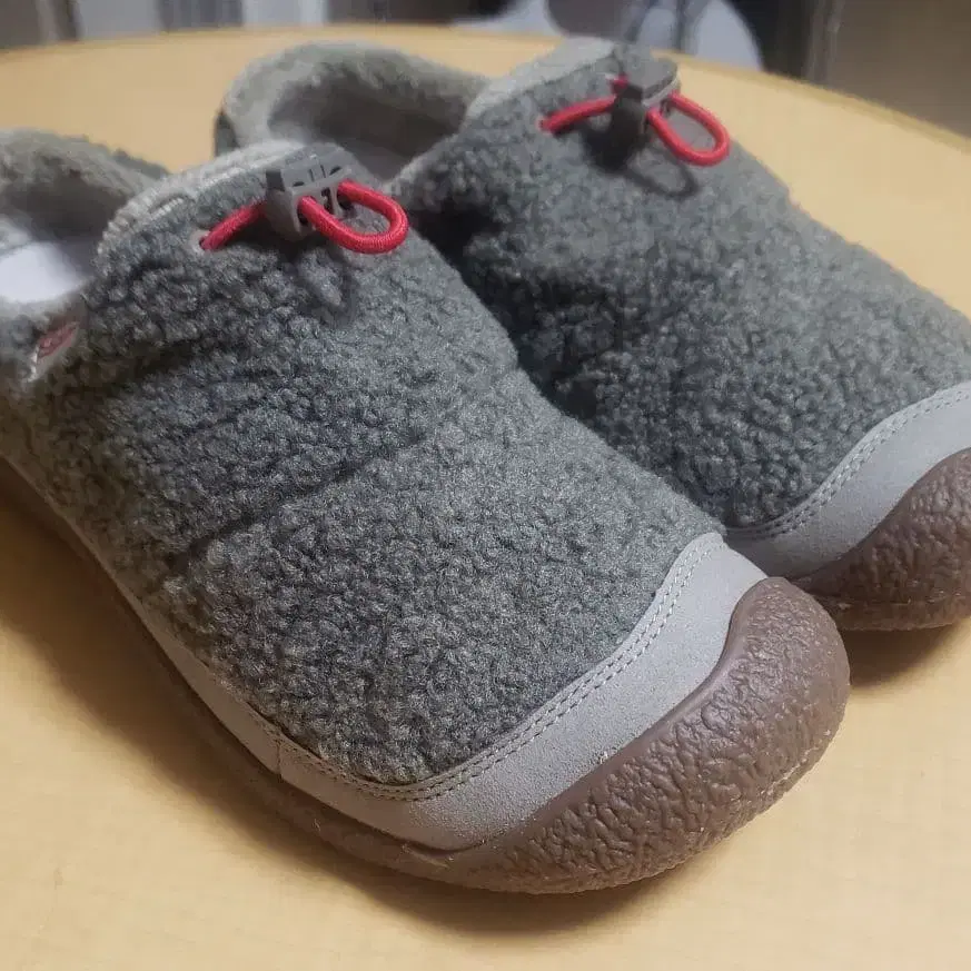 플리스 소재의 그레이 슬립온, 빨간색 끈 포함으로 쾌적한 착용감. - 색상: 그레이 - 소재: 플리스 - 디자인: 슬립온 - 장식: 빨간색 끈 - 밑창: 러버 솔 전용 상자는 없습니다