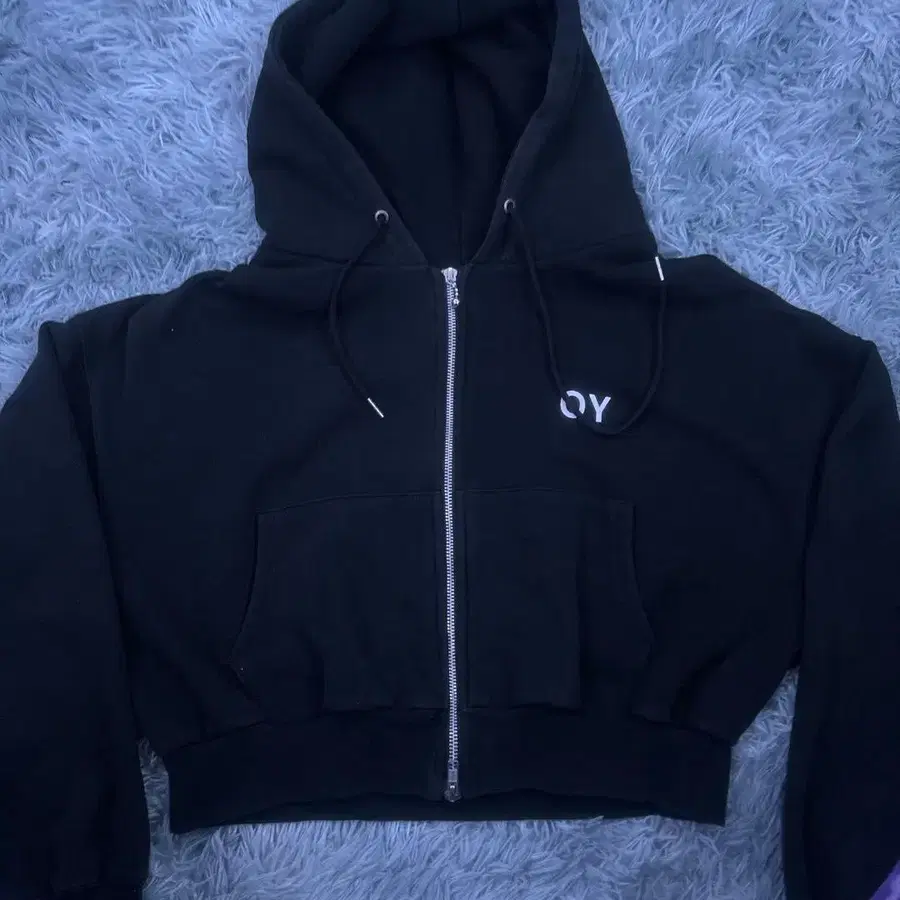 플라워 그래픽이 특징인 블랙 크롭 후드티.