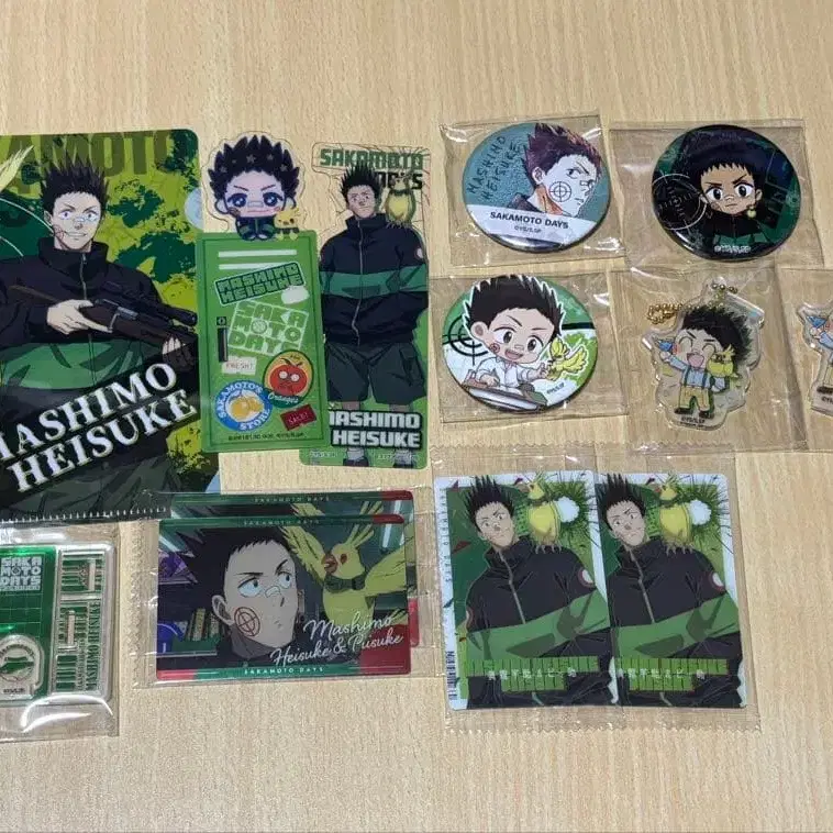 사카모토 데이즈의 마시모 헤이스케 캐릭터 굿즈 세트. 캔뱃지, 카드, 아크릴 스탠드 등. - 아이템 수: 총 10점 이상. 아이템/종류 - 캔뱃지