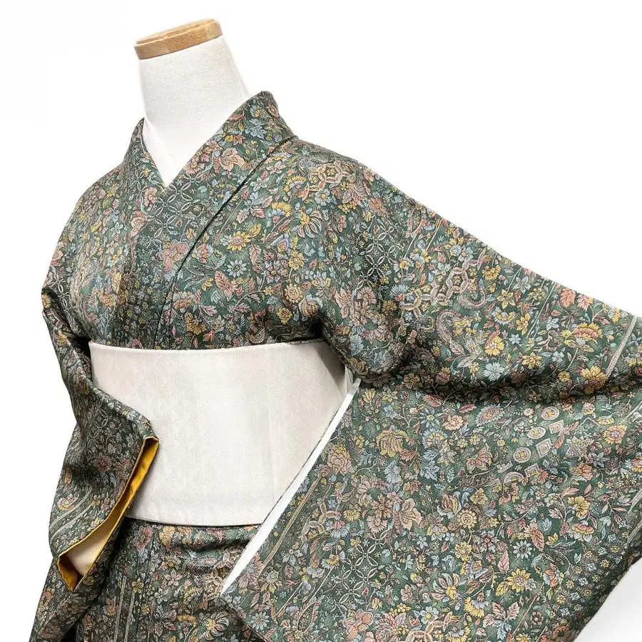 블로킹 염색의 깊은 그린색 크레이프 원단에 찢어진 듯한 모양으로 당화와 페이즐리, 칠보와 마름모 무늬가 그려진 멋스러운 디자인의 한 벌입니다.