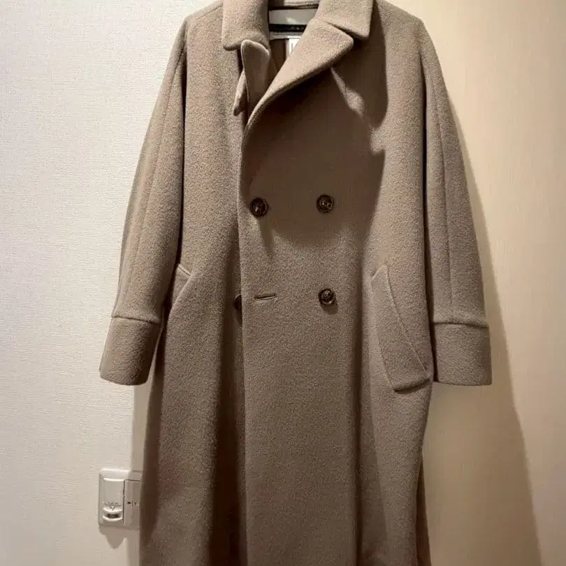 TICCA의 베이지 더블 브레스트 롱 코트, 사이드 포켓 포함.