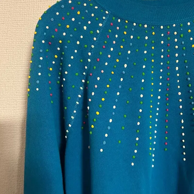 장식이 더해진 파란색 크루넥 긴팔 트레이닝복.