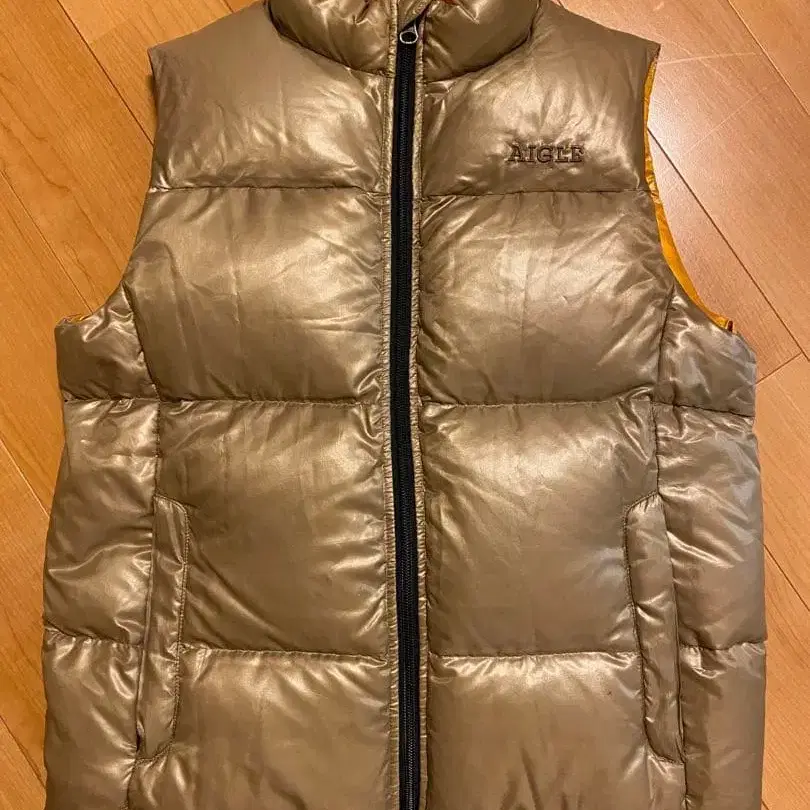 AIGLE (에이글)의 다운 베스트입니다. 매우 발색이 좋으며, 베이지색이라고도 카키색이라고도, 혹은 차분한 골드색이라고도 할 수 있는 색상으로 마실용 옷으로도 돋보이는 아이템입니다.