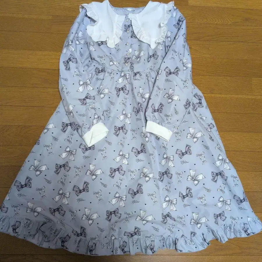 리본 무늬의 라이트 블루 원피스, 프릴 옷깃과 긴팔 디자인이 특징입니다. - 색상: 라이트 블루 - 디자인: 리본 무늬 - 옷깃: 프릴이 달린 화이트 옷깃 - 장식: 하트 버튼 포함 방문해 주셔서 감사합니다. 색상 - 블루 계열