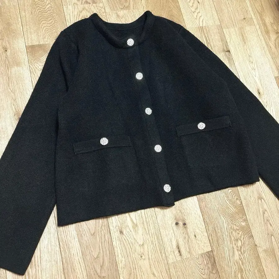 포근하고 따뜻한 니트를 사용한 골드 버튼 아우터.