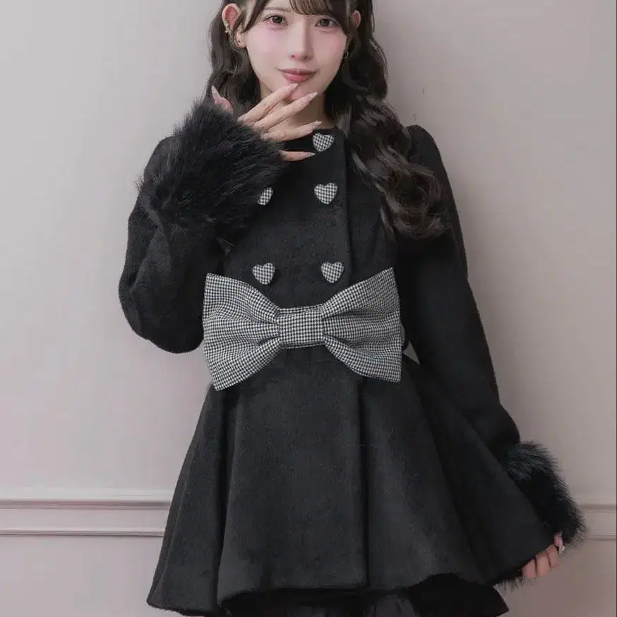 pium 하트 버튼 리본 벨트 샤기 코트