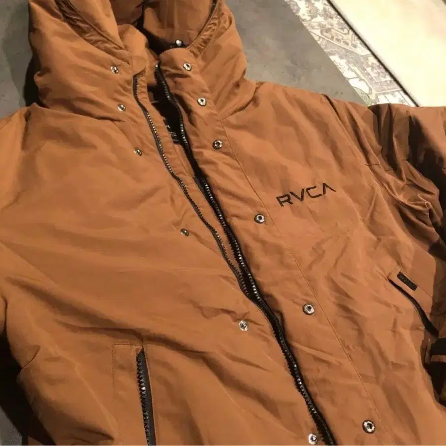 RVCA의 브라운 다운 자켓, 스타일리시하고 보온성이 뛰어난 디자인.