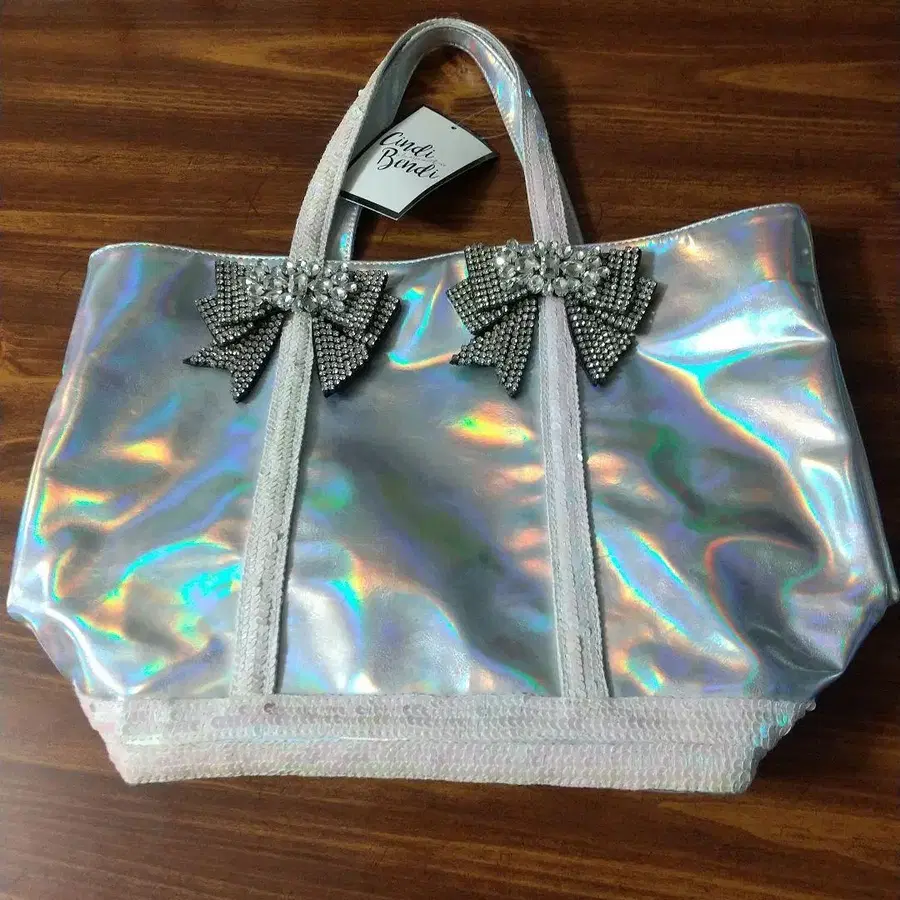 실버 합성 피혁 토트백, 비쥬 장식 리본. - 색상: 레인보우 컬러 - 디자인: 리본 장식 - 장식: 비쥬 장식 리본 - 소재: 합성 피혁 - 스타일: 토트백 방문해 주셔서 감사합니다.