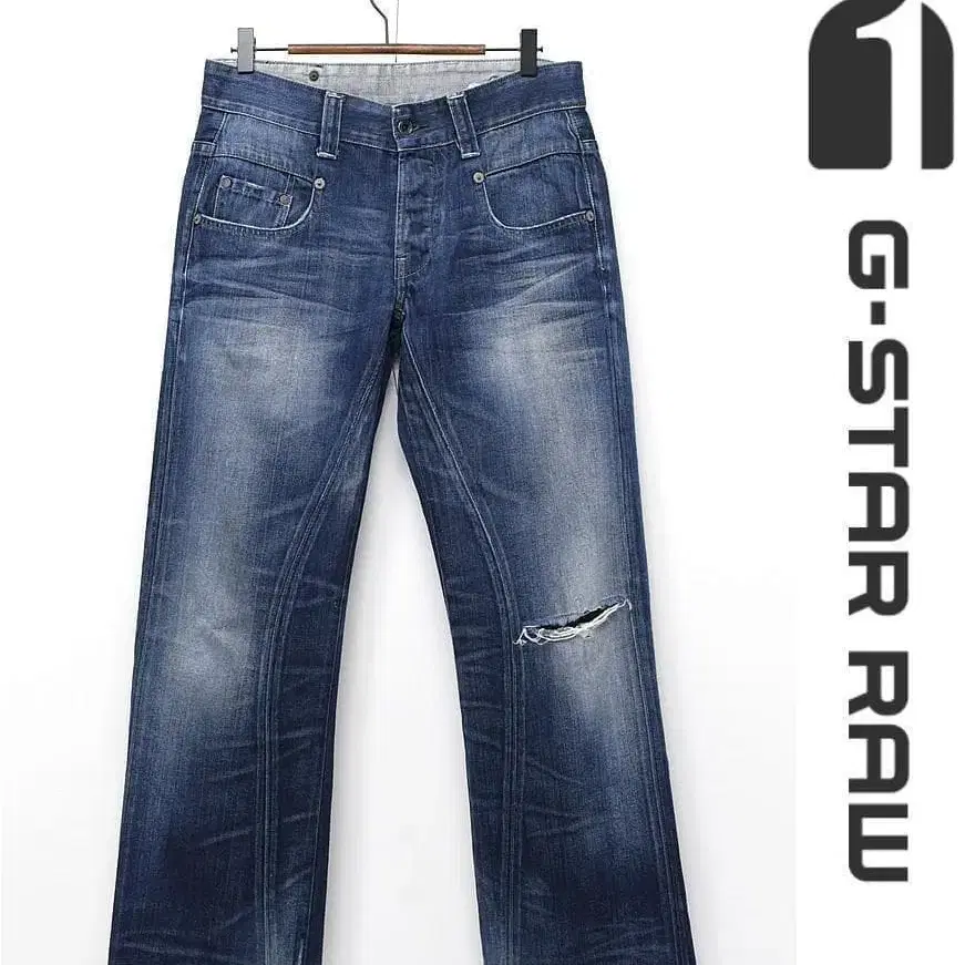 G STAR RAW 데님 청바지 팬츠 입체 재단 버튼 플라이 옆트임 체인 스티치 가죽 패치
