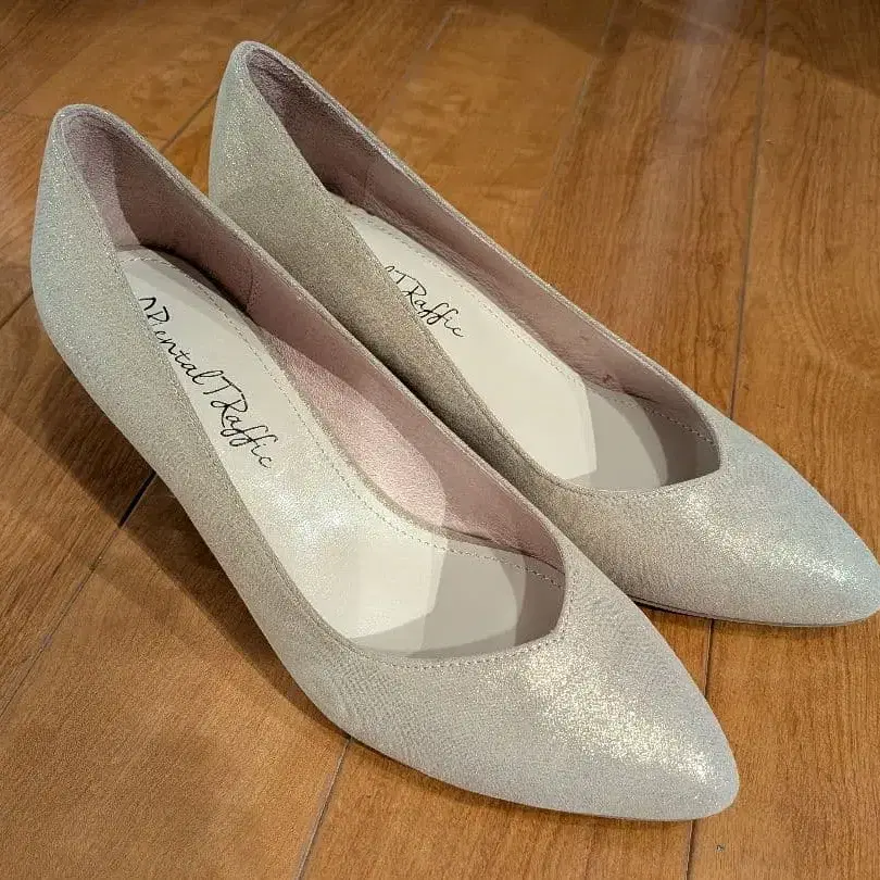 골드 글리터 마감으로, 힐 부분에 큐빅 장식이 있는 엘레강트한 펌프스입니다. 반짝이는 느낌보다는 베이지에 가까운 차분한 색감으로 평소에도 사용할 수 있는 디자인이라고 생각합니다. 사이즈 40 (25cm) 힐 6cm