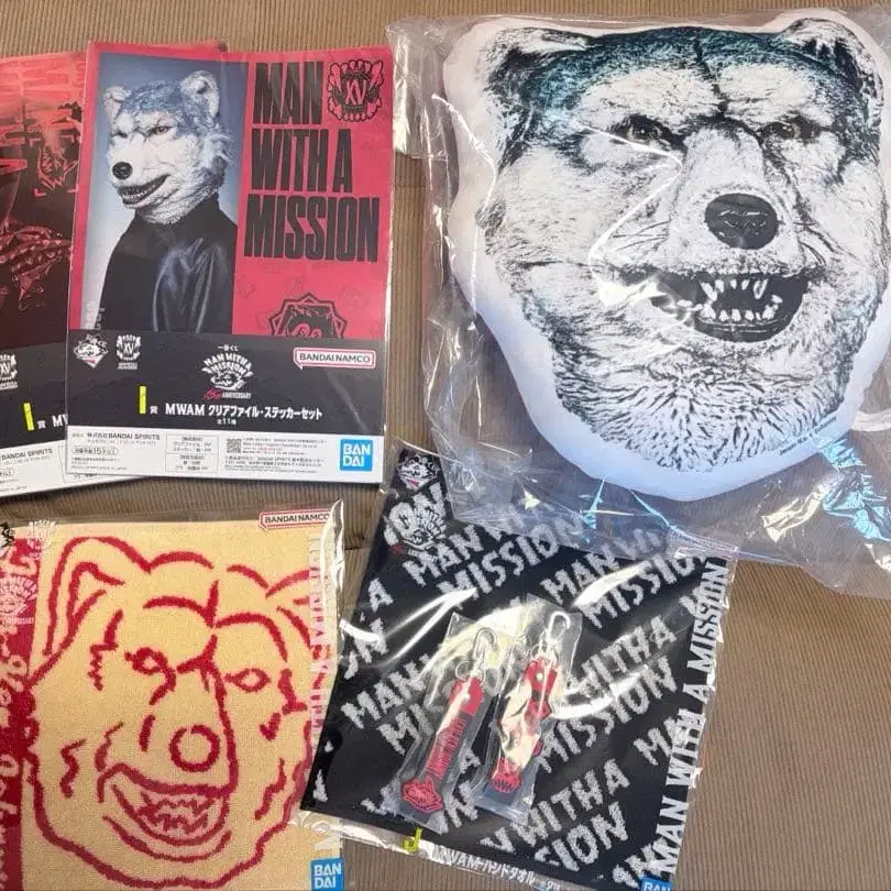 장켄 조니 JEAN-KEN JOHNNY의 쿠션과 굿즈 세트. - 상품명: MAN WITH A MISSION 굿즈 - 아이템 타입: 쿠션, 타월, 클리어 파일, 뽁뽁이 참, 핸드 타월 방문해 주셔서 감사합니다. 맨위즈 제일복권의 경품입니다.