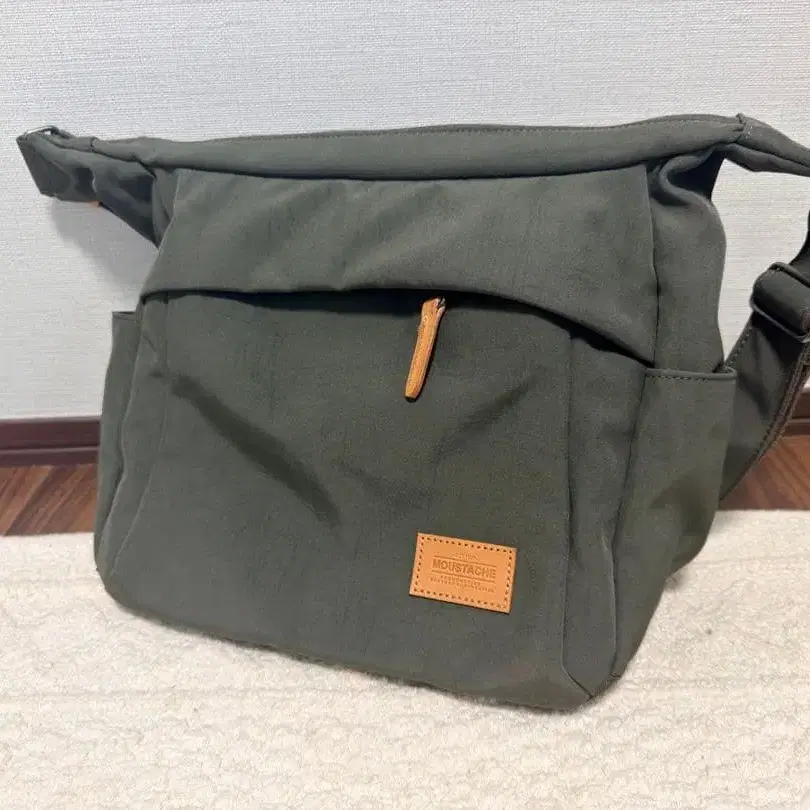 올리브 그린 색상의 캔버스 소재 숄더백이며, 조정 가능한 스트랩과 여러 개의 포켓이 있습니다.