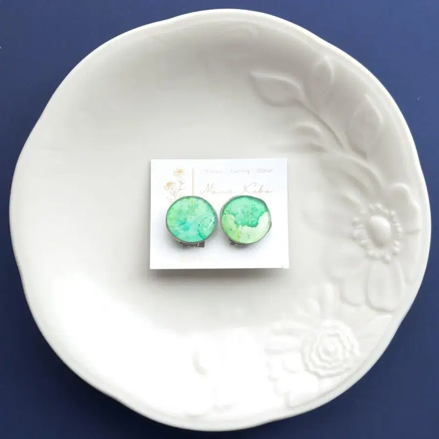 수채 물감을 번지게 한 듯한, 부드러운 그린 컬러의 귀찌입니다. 하나하나 무늬의 발현이 달라, 똑같은 것은 두 번 다시 없는 하나뿐인 아이템입니다. 투명감이 있으면서도, 확실히 존재감이 있는 사이즈감이기 때문에 심플한 복장의 악센트로도 추천합니다. 가볍고 착용하기 쉬운 손바닥 사이즈 (사진 참조) 핸드메이드 작품이므로, 기성품과 같은 완벽함을 원하시는 분은 삼가해 주십시오.