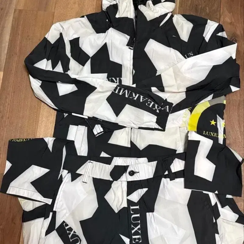 화이트와 블랙의 기하학 패턴이 특징인 경량 자켓으로, 후드가 부착되어 스타일리시합니다.