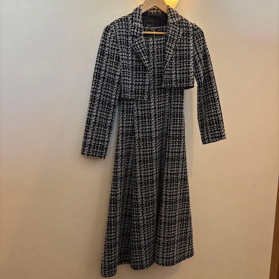 세레모니에 사용할 수 있는 고급 트위드 자켓과 플리츠 스커트 세트