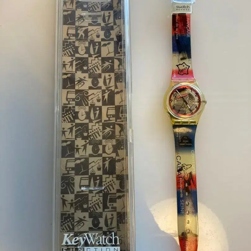 컬러풀한 아트 디자인의 스와치 손목시계. - 브랜드: swatch - 모델명: KeyWatch - 기능: 방수 30m - 디자인: 컬러풀한 스트랩에 아트 디자인 - 소재: 플라스틱 케이스와 스트랩 - 제조국: 스위스산 방문해 주셔서 감사합니다. 작동 확인은 하지 않았습니다.